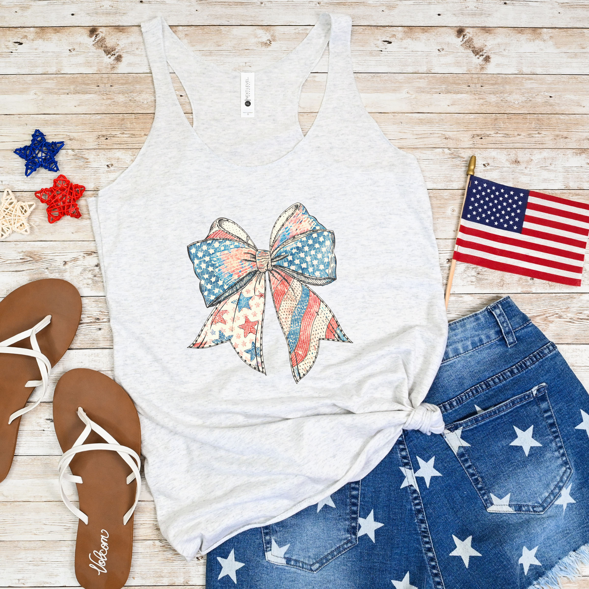Celebrate the 4th of July in style with our Coquette American Bow tank top! The racerback design allows for maximum comfort and movement while the patriotic bow graphic adds a touch of flair. Show off your love for your country with this festive and fashionable tank top!