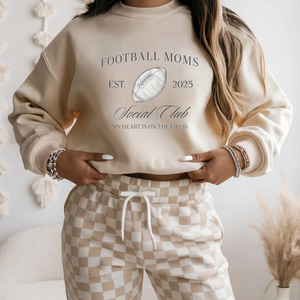 Celebrate your team spirit and camaraderie with the Football Moms Social Club Graphic Crewneck Sweatshirt. Designed for comfort and style, this sweatshirt is perfect for showing pride in your football mom status while staying cozy at games or everyday outings. Its soft material and flattering fit make it an essential addition to your wardrobe, helping you connect with other fans while looking great. Make every football season unforgettable with this standout crewneck.