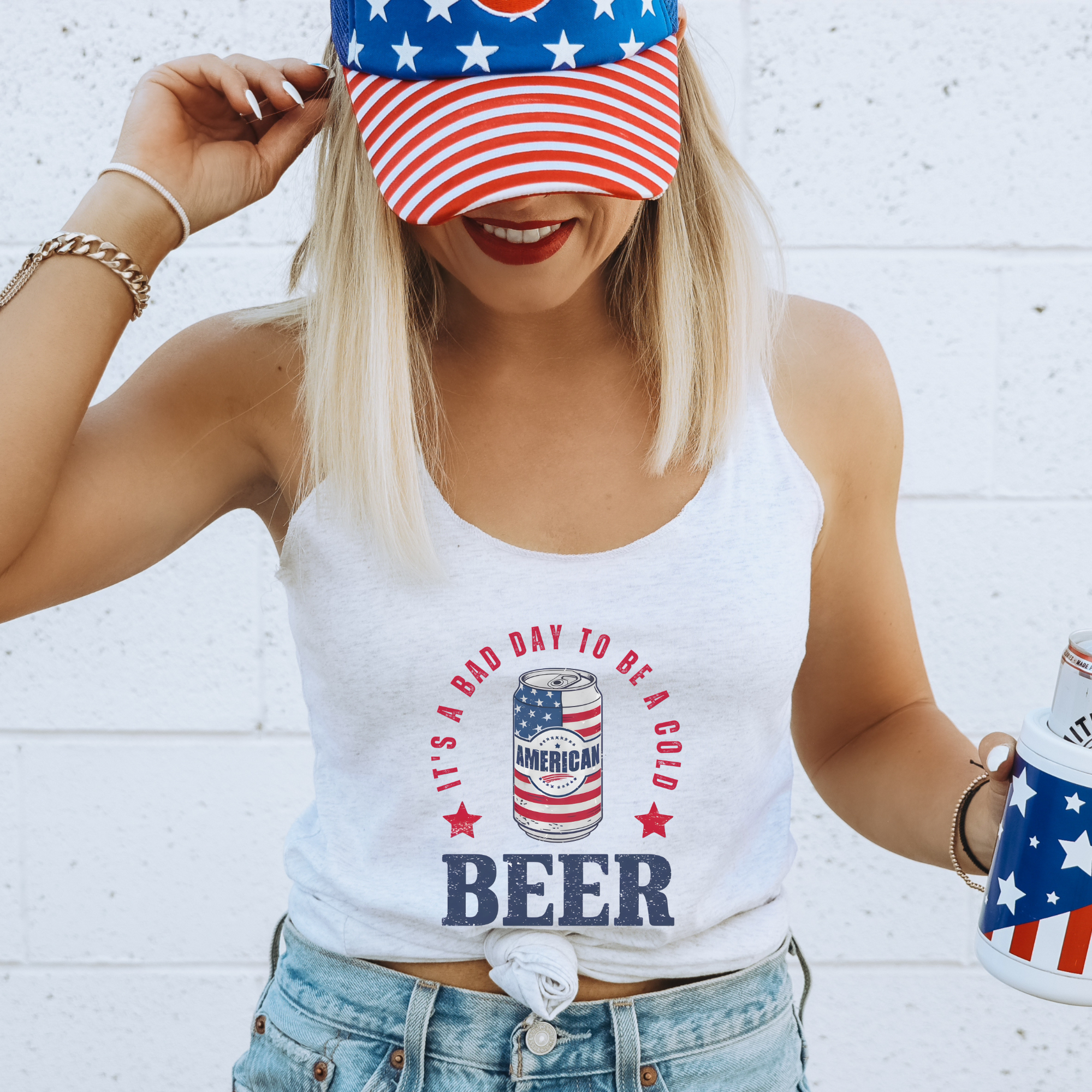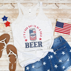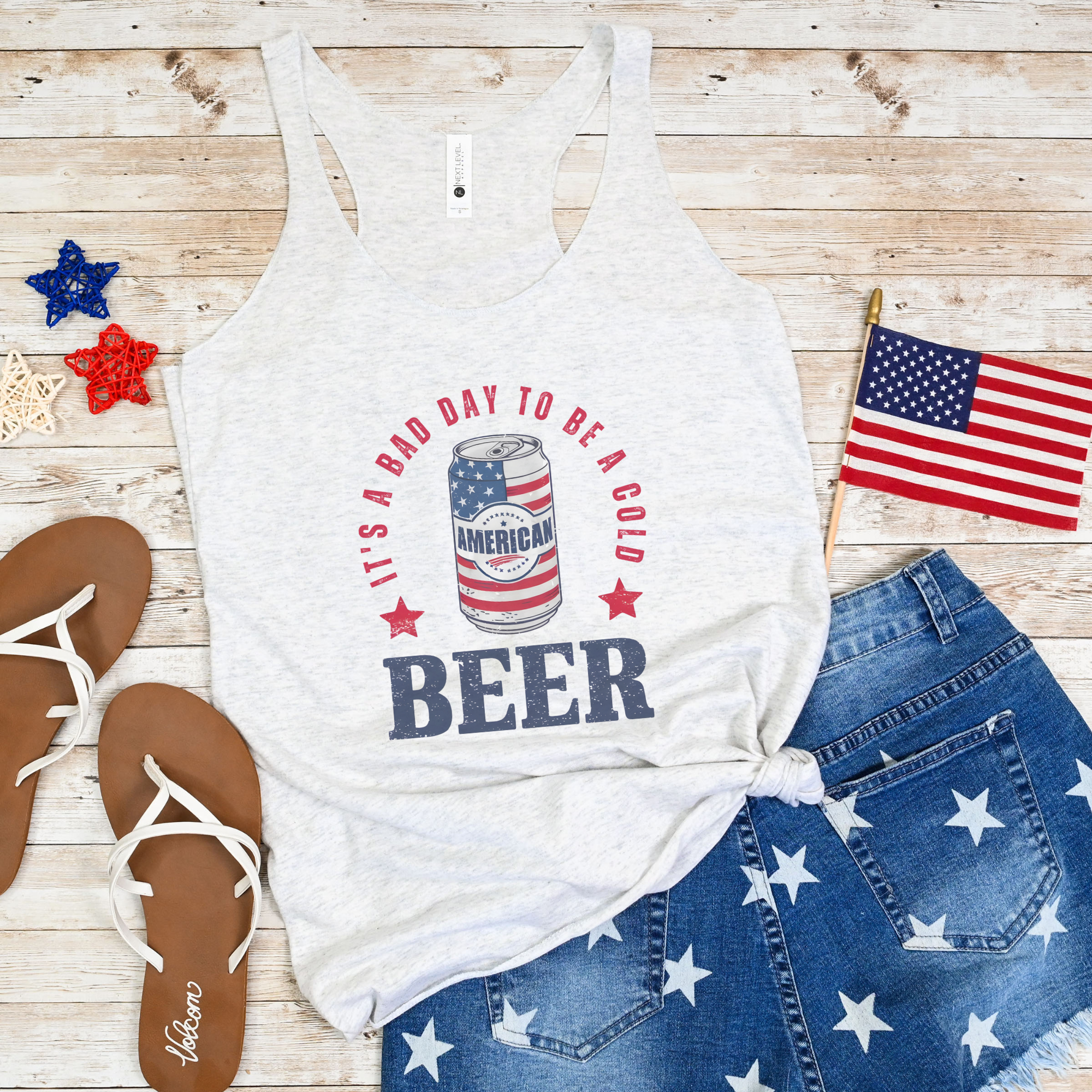 Celebrate Independence Day in style with our "It's a Bad Day to be a Cold Beer" racerback tank top! Featuring a unique graphic design, this tank top is perfect for any 4th of July celebration. Stay cool and comfortable while showing off your patriotic spirit with this must-have tank top!