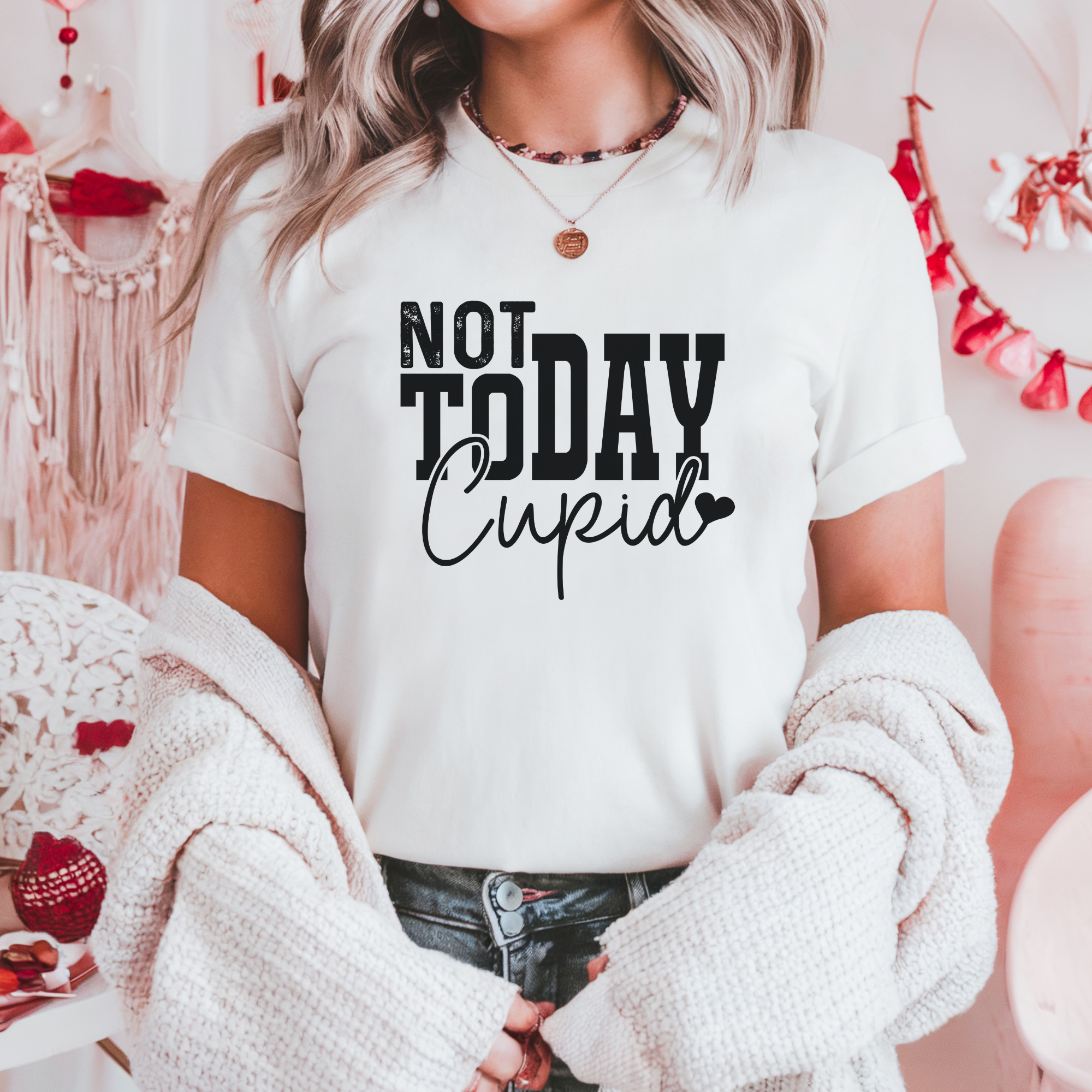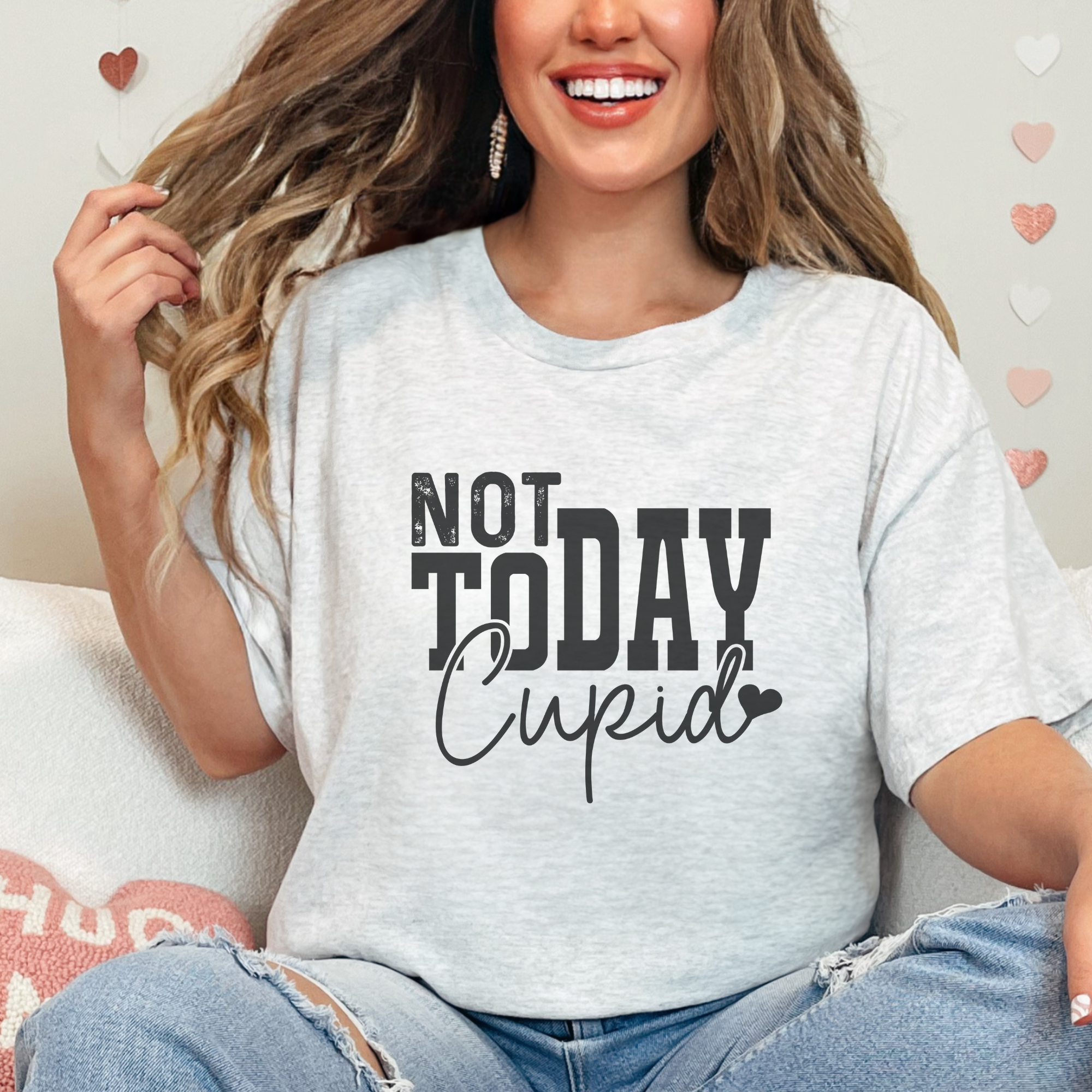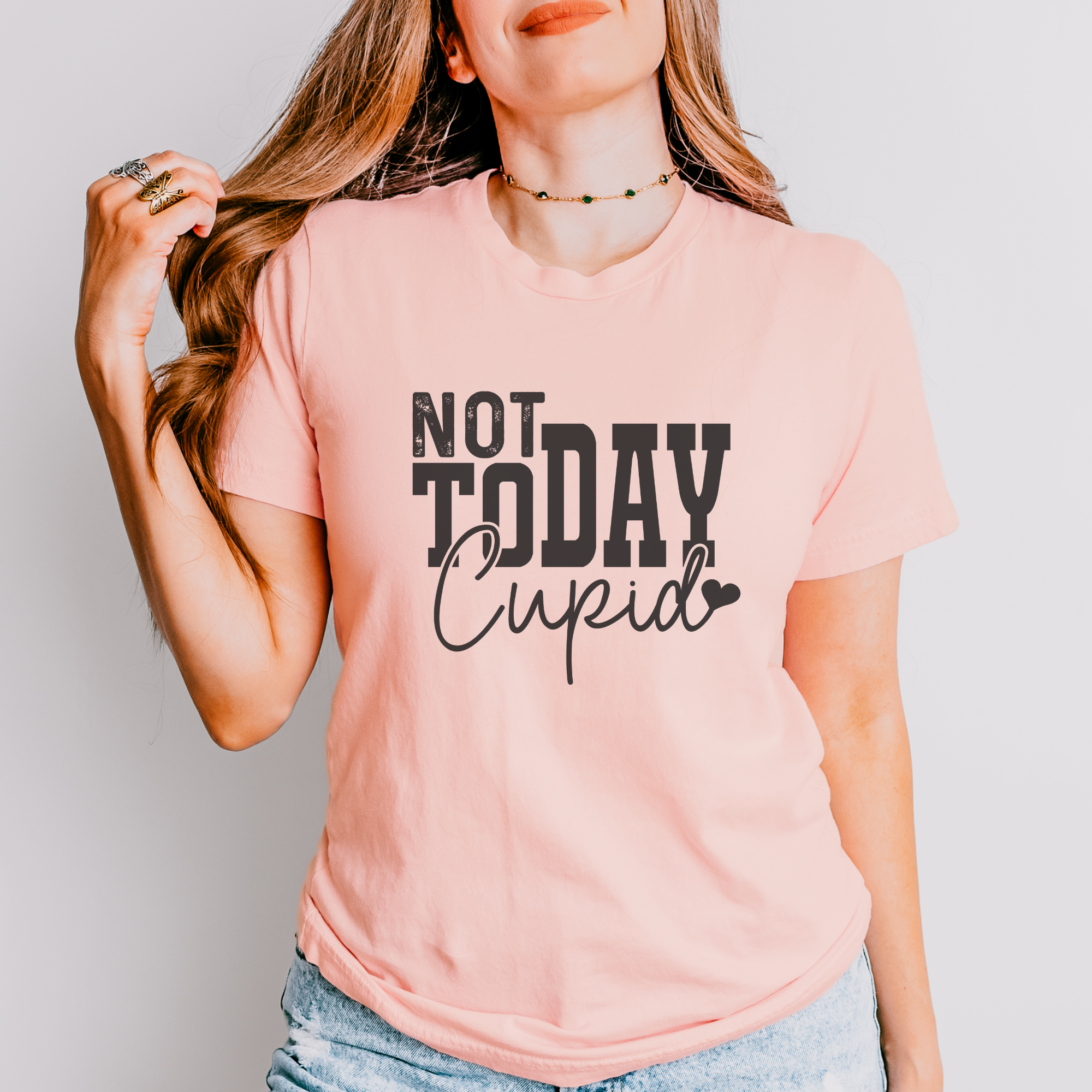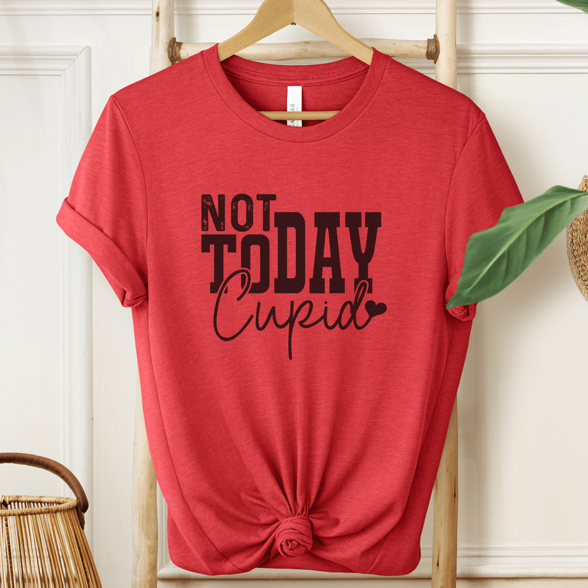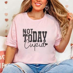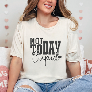 Declare your independence from Cupid this Valentine's Day with our "Not Today Cupid" graphic t-shirt! Show off your resistance to love and commitment with this bold and sassy tee. Perfect for single ladies who are taking control of their love lives and standing up to the pressures of this holiday. The perfect statement piece for those who embrace their independence and aren't afraid to say "not today" to Cupid's arrows.